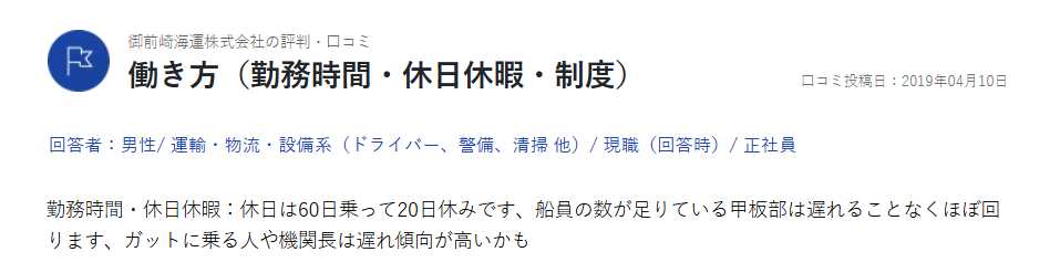 この口コミは2019年時点のものですが、2024年6月から乗船サイクルを40日乗船、20日休暇